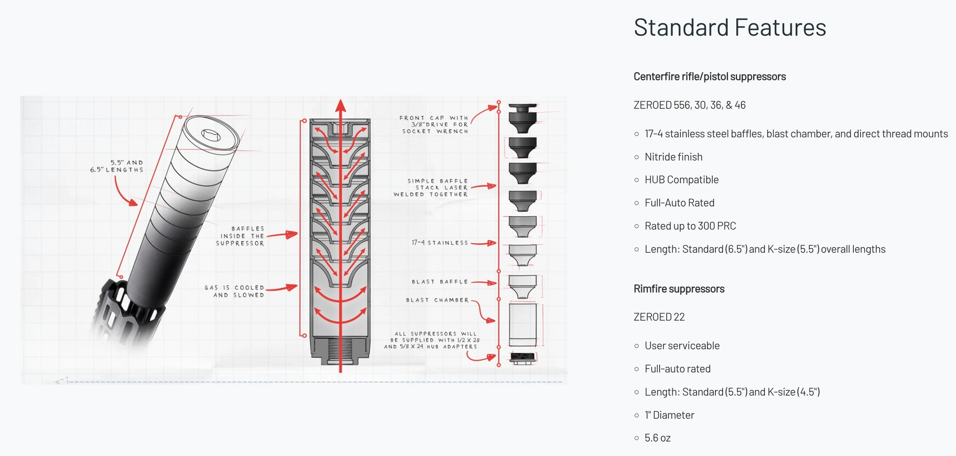 ZEROED 36K suppressors are "K" (compact) sized, with an overall length of just 5.5" with the included direct thread mount installed. If you've already got a suppressor or preferred QD mounting system, the ZEROED 36K is HUB compatible, allowing you to use any other HUB pattern QD mount and muzzle device setup you like best. For easy disassembly, the included direct thread mounts feature 7/8 wrench flats and the suppressor features a 3/8 square drive in the end cap.