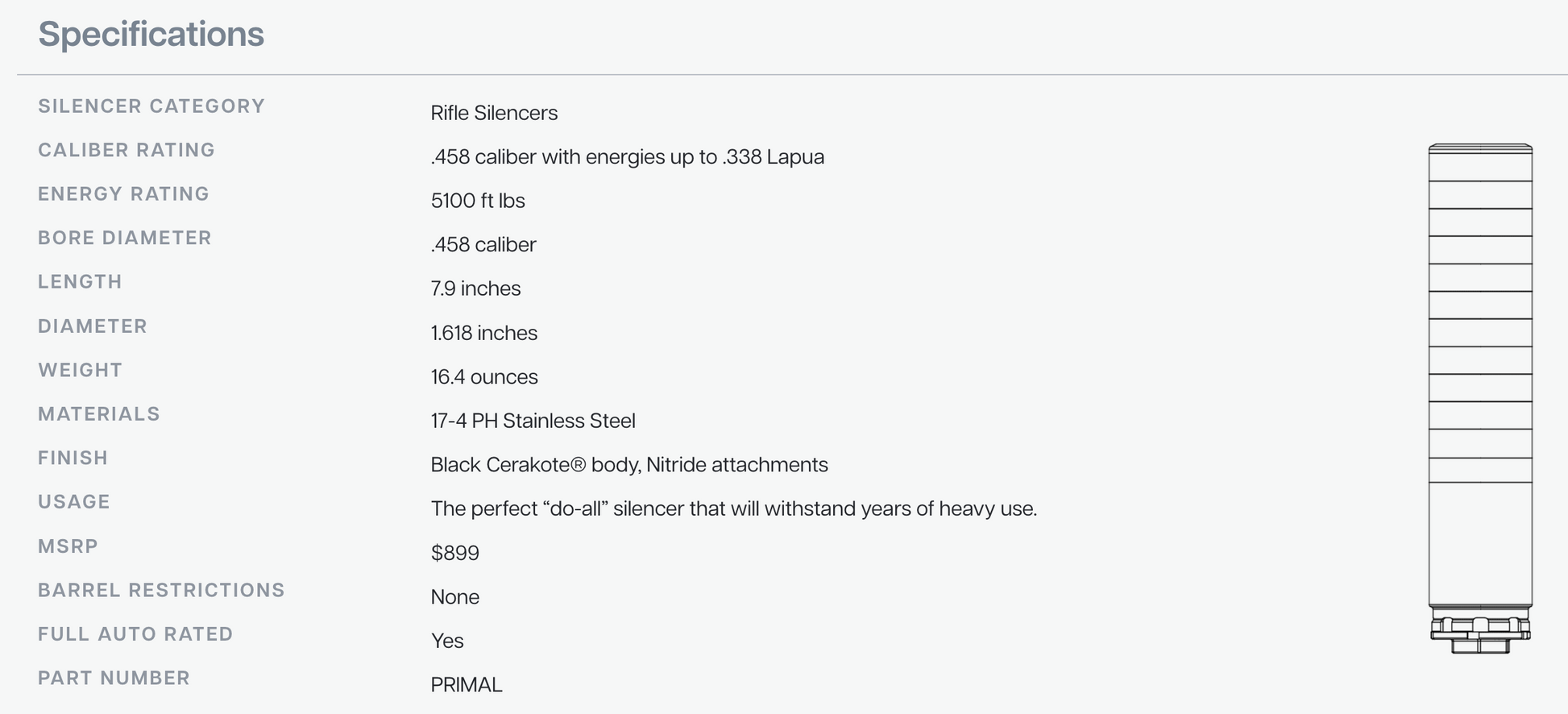 From 9mm to .45 ACP, and 45-70 to .338 Lapua, like a rabid beast the Primal will eat just about anything you give it. If you only want one silencer (to begin with), the Primal is it. Feed it what you want, mount it how you want. Your gun is waiting.
