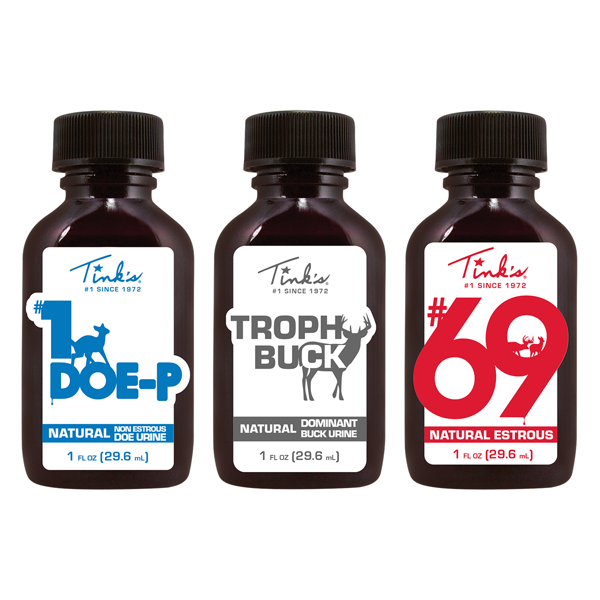 - SCENTS INCLUDED: 1 oz. plastic bottles of each: #69 Doe-In-Rut, #1 Doe-P, and Trophy Buck.